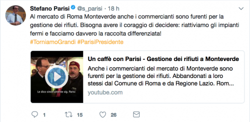 Stefano Parisi si concentra invece sul tema rifiuti, una partita importantissima che il prossimo governatore – chiunque esso sia – dovrà prendere di petto. Con grande abilità il candidato del centrodestra inserisce il tema in quello più ampio del malessere dei commercianti nella gestione dei rifiuti, per poi ribadire che sarà necessario riattivare altri impianti: