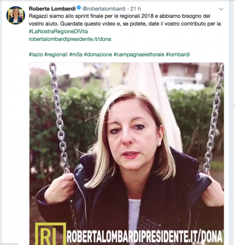 Dopo giorni passati a parlare del caso-rimporsopoli, Roberta Lombardi torna a parlare di Lazio e lo fa con un video in cui chiede ai suoi supporters un ultimo sforzo, anche economico, per sostenere la campagna laziale del Movimento Cinque Stelle: