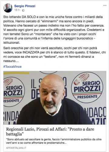 Tra l’agguerrito e l’amareggiato Sergio Pirozzi. Il sindaco di Amatrice continua il suo tour tra le province laziali ma non si concede anche qualche sfogo. Pirozzi – come spesso accaduto anche in passato – rimarca la propria unicità rispetto ad altri candidati supportati da una rete partitica forte e diffusa: