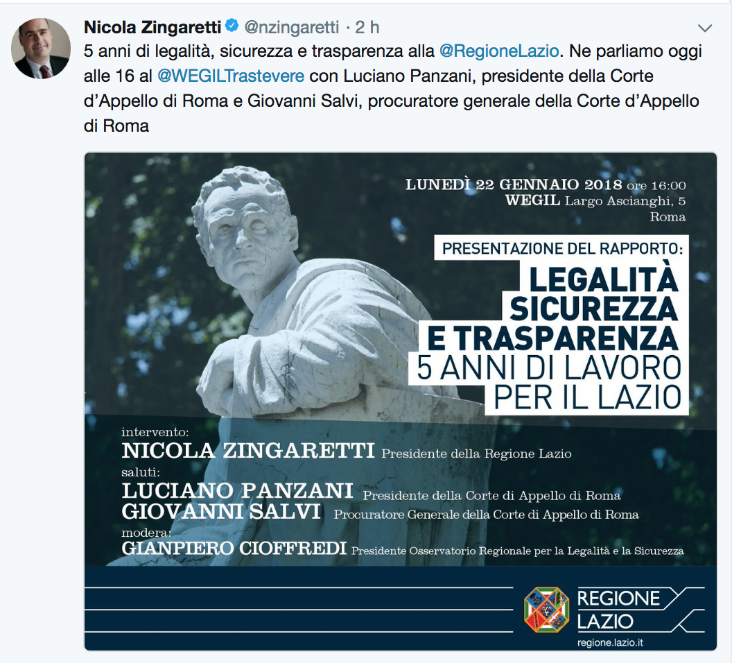 Tra tutti, merita una menzione particolare il tweet di lunedì, dove Zingaretti ha annunciato la presentazione del rapporto sulla legalità, la trasparenza e la sicurezza nel Lazio negli ultimi cinque anni. Per l’esponente PD, che ha il vento dei sondaggi in poppa, è l’occasione per toccare da protagonista un tema caro a tanti elettori che nelle urne tendono ad affidarsi a formazioni di destra o conservatrici, partiti che hanno nella “sicurezza” la propria bandiera e parola d’ordine. Mostrare, in tal senso, risultati incoraggianti potrebbe rappresentare un’esca valida in un mondo che di solito tende a scegliere altri candidati.