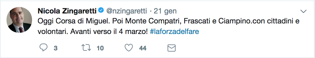 Iperattivo Nicola Zingaretti. Il governatore uscente, il più presente su Twitter tra tutti i candidati, ha trascorso il fine settimana in eventi o in paesi del Lazio ostentando l’attivismo anche sui social: