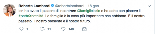 in secondo luogo, con l’incontro con il Forum delle Famiglie del Lazio per avallare la proposta di un patto per la natalità. Il forum è guidato da Gigi De Palo, ultracattolico ed ex assessore della giunta Alemanno.