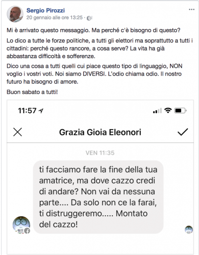 Infine c’è Sergio Pirozzi e il caos totale che regna nel centrodestra nell’individuazione di una candidatura vincente o quantomeno competitiva. E qui, in attesa di sviluppi, l’unico candidato in campo resta l’ex sindaco di Amatrice. Dopo il bagno di folla all’Atlantico, Pirozzi è meno loquace sui social ma ha postato lo stesso cose significative, come una sgradevole minaccia che ha suscitato uno sdegno e una solidarietà trasversale.
