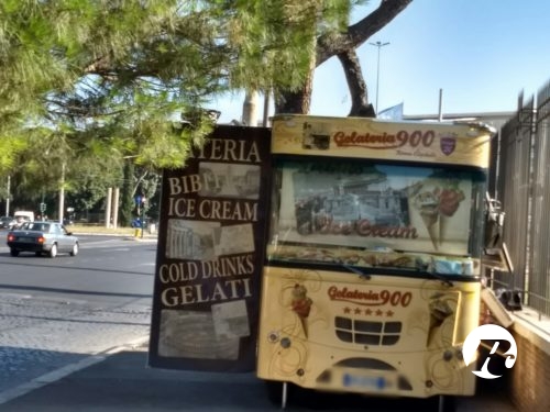 Un camion bar sopra il marciapiede sulla strada che collega Colosseo e Circo Massimo, ai piedi del Palatino. Non sappiamo se questa collocazione sia definitiva o provvisoria. Quel che è certo è che quella attuale occupa l’intero marciapiede e quasi impedisce il passaggio.
