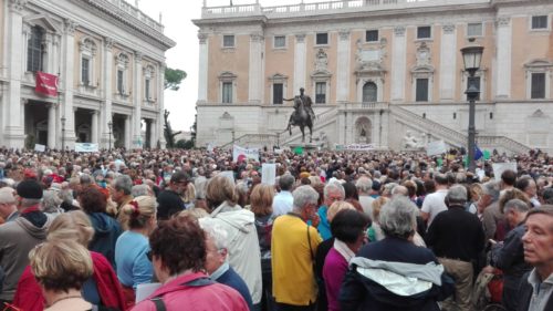 Circa 5 mila cittadini sono a piazza del Campidoglio per la manifestazione “Romadicebasta”. Un sit in spontaneo nato da un profilo Facebook creato da sei donne, che ha l’obiettivo di destare l’attenzione dei cittadini della Capitale, ma anche di tutta Italia sul degrado di Roma. Molte delle persone presenti hanno chiesto le dimissioni di Raggi.