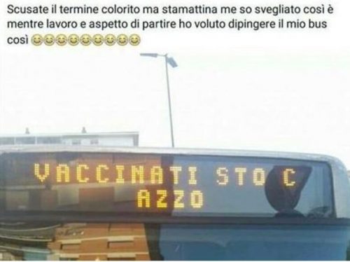 volgaritá: ‘Vaccinati sto c…’. E poi, non pago, ha fotografato il “suo” bus e ha postato l’immagine sulla pagina Fb no vax ‘Genitori e bambini liberi e sani – popolo unico’, con una certa fierezza.