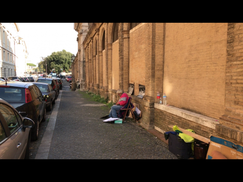 John sosta durante il giorno a Borgo Santo Spirito, la notte dorme nelle vicinanze sotto un cumulo di coperte, facendosi scudo di cartoni che periodicamente sostituisce andando a rovistare nei cassonetti dell’immondizia.