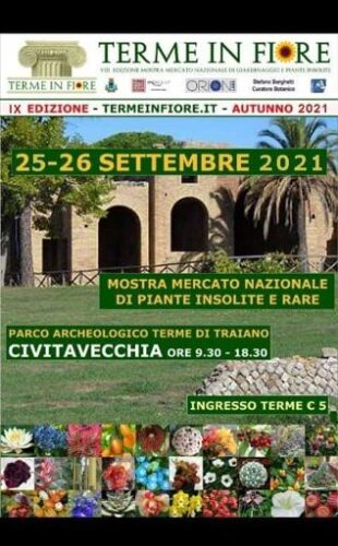 Sabato 25 e domenica 26 settembre alle Terme di Traiano di Civitavecchia torna “Terme in fiore” che giunge alla sua nona edizione. Evento ormai noto ai cultori del verde di qualità, offre la possibilità di acquistare piante esotiche rare, non presenti nella grande distribuzione, coltivate su territorio italiano da vivaisti specializzati, adattabili ai nostri giardini ed appartamenti.