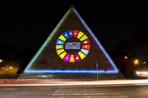 Acea illumina la Piramide Cestia con i simboli degli obiettivi di sviluppo sostenibile