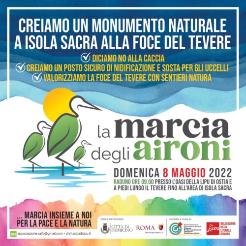 Sono oltre 60 le associazioni che hanno aderito alla “Marcia degli Aironi”, domenica 8 maggio, fra Ostia e Fiumicino, su un tragitto di circa sei chilometri, indetta dalla Lipu e dal associazione Saifo.