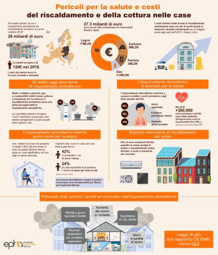 “Tutto ciò costa a ogni famiglia italiana 180 euro all’anno di spesa sanitaria; nell’Unione Europea a 27, con il Regno Unito, i costi sono ammontati a 29 miliardi di euro, lo 0,2% del Pil. La maggior parte dei costi si riferisce alle emissioni dirette dentro l’abitazione. Per esempio, i bambini che vivono in casa con stufa una a gas hanno un 42% in più di avere l’asma”.
