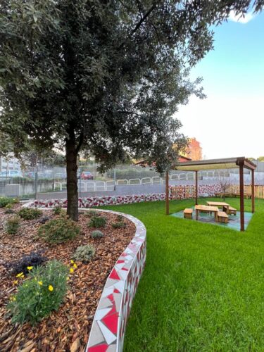 Lo spazio esterno è stato progettato e realizzato come ambiente di vita e di benessere, come luogo di incontro e relazione, ma soprattutto come spazio per l’apprendimento. I lavori hanno interessato la messa in sicurezza dell’intera area, a partire dalla demolizione delle vecchie recinzioni in ferro e dal consolidamento del muro perimetrale in cemento armato con la realizzazione di un murale per ridurre l’impatto visivo. All’interno dell’area esterna è stata sostituita la pavimentazione ammalorata con uno strato di compost e l’impianto di un nuovo manto erboso, sono stati piantumati 6 nuovi alberi, realizzate nuove aiuole rialzate con 60 tipi di arbusti diversi, installate strutture ombreggianti per far fronte al sole estivo, realizzate delle piccole collinette per consentire l’attività psicomotoria all’esterno e allestite zone tematiche con collocazione di sabbiere, percorso sensoriale, piccolo scivolo, ponticello, capanna in legno, cucina all’aperto, strutture pikleriane e l’allestimento delle due chiostrine interne per i giochi con l’acqua, con la realizzazione di un manufatto con sei lavandini ad altezza bambino.