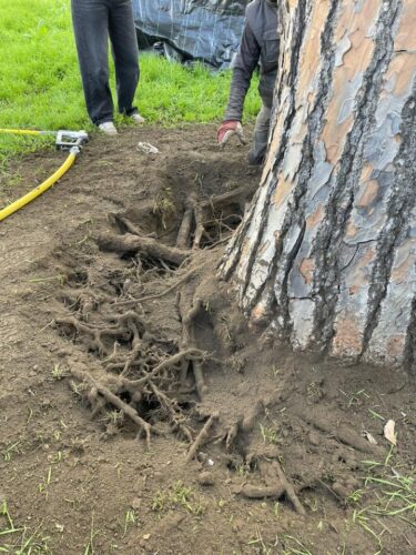 Il Dipartimento Tutela ambientale ha avviato lavori specialistici di ancoraggio delle radici portanti delle zolle, attraverso uno scavo non invasivo realizzato con tecnologia Air-Spade. Il sistema consente di individuare le radici principali e installare tiranti che distribuiscono meglio le sollecitazioni del vento, riducendo il rischio di cedimenti.