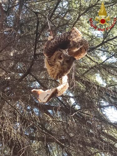 Dopo la liberazione da parte dei pompieri, il rapace è stato consegnato ad una volontaria, per la custodia e la messa in sicurezza.