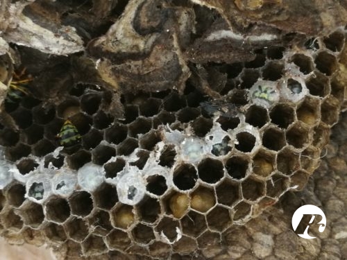 In questo rifugio ci sono anche le cellette che contengono le larve. Un “alveare”, come quello che vedete, può contenere migliaia di vespe, ognuna con il proprio compito. Solo le femmine pungono anche ripetutamente.