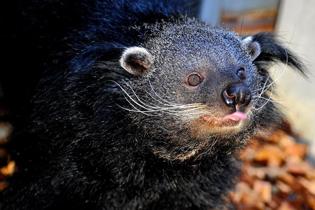 Binturong, nella lingua malese, significa ”orso gatto”, sebbene l’animale non abbia affinità né con i gatti né con gli orsi: appartiene all’ordine dei carnivori, ma si nutre anche di frutti e fiori, e abita le foreste tropicali del sud-est asiatico, fino a 3.000 m di altitudine.