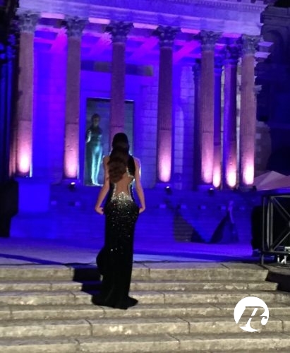 E proprio un abito della sua prima collezione ha aperto la sfilata che si è svolta nel suggestivo set cinematografico di Cinecittà, che riproduce le bellezze architettoniche della Roma imperiale.