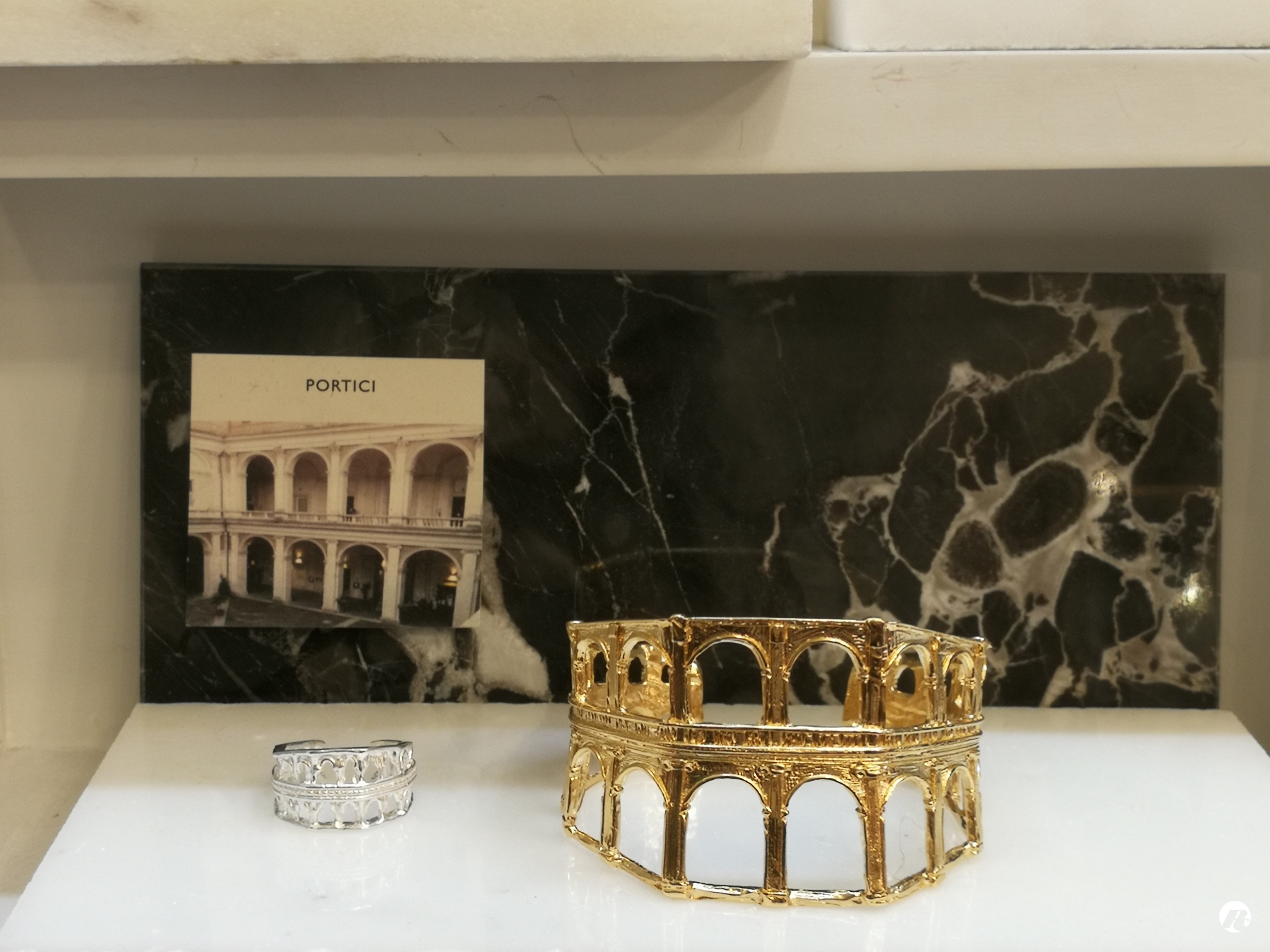 Un grande fascino, tipicamente romano, hanno tutte le creazioni ispirate “ai portici” del Collegio Romano e quelle che si rifanno agli “intrecci” della struttura del Gasometro.