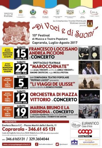 La decima edizione del festival “Di Voci e Di Suoni” inizierà il 15 luglio e finirà il 19 agosto con appuntamenti a cadenza settimanale e si terrà a Caprarola (VT), in parte, presso Piazza Monsignor Sebastiani Giuseppe, nel centro storico del paese, ed in parte, presso il Piazzale del Convento di Santa Teresa, con il seguente programma: