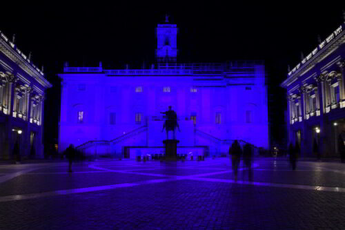 Il Campidoglio illuminato di blu in occasione della Giornata nazionale delle vittime civili delle guerre e dei conflitti nel mondo.