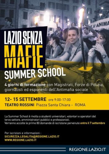 Le iscrizioni alla terza edizione della Summer school antimafia promossa, dal 12 al 15 settembre, dall’Osservatorio per la sicurezza e la legalità della Regione Lazio hanno registrato “un successo senza precedenti rispetto alle edizioni precedenti. Sono infatti 400 le persone che fino a questa mattina si sono iscritte, tra cui studenti e docenti universitari, amministratori e dirigenti pubblici, professionisti, rappresentanti delle Forze di Polizia, volontari del terzo settore e dell’associazionismo antimafia”. È quanto si legge in una nota della Regione Lazio.
