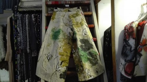 In questi giorni e per la primavera/estate 17 alcuni capi esposti sono delle vere opere d’arte. Gli abiti di cui parliamo hanno tagli essenziali e rigorosi senza concessioni e stramberie modaiole. I tessuti sono naturali: cotone, lino, seta e tutti prelavati. E fin qui ci sarebbe poco di particolare… ma diventano abiti d’eccezione per le “fantasie” e i “disegni” che li decorano. Tutti sono dipinti a mano. Ogni capo è unico. Proprio come dev’essere un quadro originale. Fabio e Marco Truffa (fratelli gemelli e titolari del negozio) con l’amico artista Mauro Caracuzzo hanno trasformato ogni singolo capo in “tela da dipingere”. Così è nata questa collezione di facile vestibilità ma carica di significati e storia. La grande passione che Fabio non si stanca di trasmettere per tutta l’arte orientale e in particolare per l’antico teatro NOH ha suggerito immagini e composizioni che si avvicinano alla raffinata estetica zen. Del Giappone intuiamo le maschere usate nelle rappresentazioni, la leggerezza e la grazia infinita di fiori e colori. Se a questo aggiungiamo che parte dei capi è stata dipinta su stoffe trovate nei bauli di una nobile e storica famiglia toscana il fascino è totale! Abiti, pantaloni, caftani, giacche e persino t-shirt hanno richiami alle antiche figure mixati a grafismi quasi spirituali.