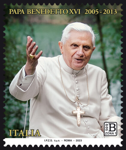Poste Italiane comunica che oggi 16 maggio 2023 viene emesso dal Ministero delle Imprese e del Made in Italy un francobollo commemorativo di Papa Benedetto XVI, relativo al valore della tariffa B zona 1-50g pari a 3,05€.