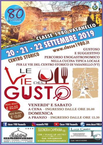 L’appuntamento con Le Vie del Gusto, il percorso itinerante enogastronomico tra piazze e cantine, è dal 20 al 22 settembre a Vasanello per riscoprire i sapori della tradizione e le vecchie cantine del borgo, in una formula unica di gusto e suggestione.