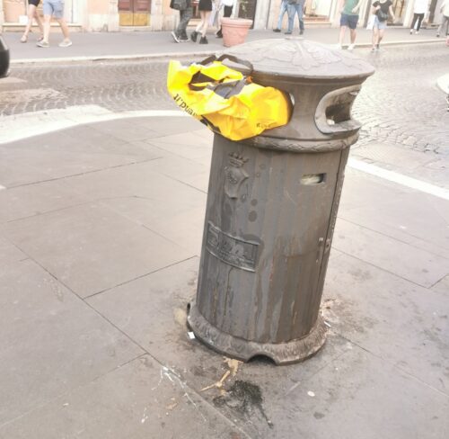 Nell’allegro paradosso dei gettacarta fantasma a noi cittadini pare che le istituzioni dedicate li muovano da una parte all’altra della Città tanto per darci l’impressione di una fattività, in realtà, fittizia. Un’enorme scacchiera su cui i cestini si muovono per una partita infinita. Difatti i gettacarta che erano su via del Babuino sono, in parte, finiti in piazza di Spagna.