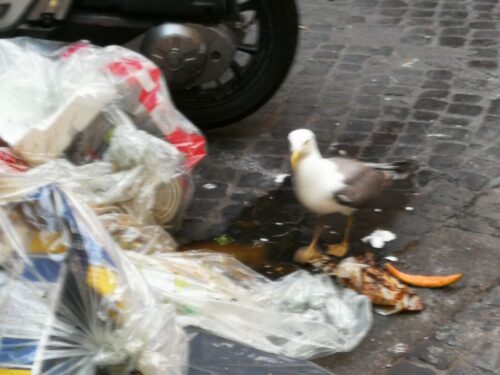 Su al Campidoglio pensavano, forse, che i turisti arrivassero forniti di occhiali fantastici capaci di cancellare lo squallore e adatti a tingere di favola il reale degrado? pensavano che solo i Romani vedessero i gabbiani becchettare famelici e rissosi nei sacchi dell’immondizia? pensavano che solo a chi paga la Tari fosse concesso il placet di scavalcare i rigagnoli di percolato lungo i marciapiedi?