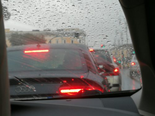 In p.zza del Popolo la fila è sempre più lunga e più bagnata. Tu ti senti un vero signore!. Il Muro Torto riserva un traffico più lento e congestionato del solito. Accidenti! Ma, alla fine arrivi a Termini. E chissà perchéti appare come la stazione più bella e ben curata della terra.