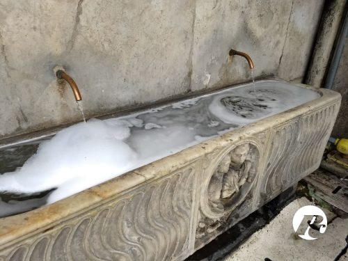 Qualche giorno fa Radiocolonna ha incontrato la splendida fontana-sarcofago in Piazza del Popolo piena di acqua e schiuma.